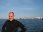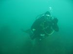 We stood in that manly MSD pose looking out to sea as Scimitar skimmed across the flat surface, windless Deep blue skies ahead, Rob the Lob, Vet and Bandit (our Two heroes) smiled, the sun glinted off Bandit's teeth, Vet hands on hips said 'This is what its all about............'!!!! Kitted up and waiting for the shout of Captain Smudge, they were about to embark on a 30 metre drift on the Shambles, Suddenly a shout went up....@Jump@ In they went, once settled on the surface Bandit indicated to dive, down, down, down they went, green bloom made it look eerie, at 20 metres it cleared as if a light had gone on, magnificent....10 to 15 viz, 11 degrees, SMB deployed once Vet had decided how he was going to blow it up, Bandit very patient tapping his fin and arms folded looking on.